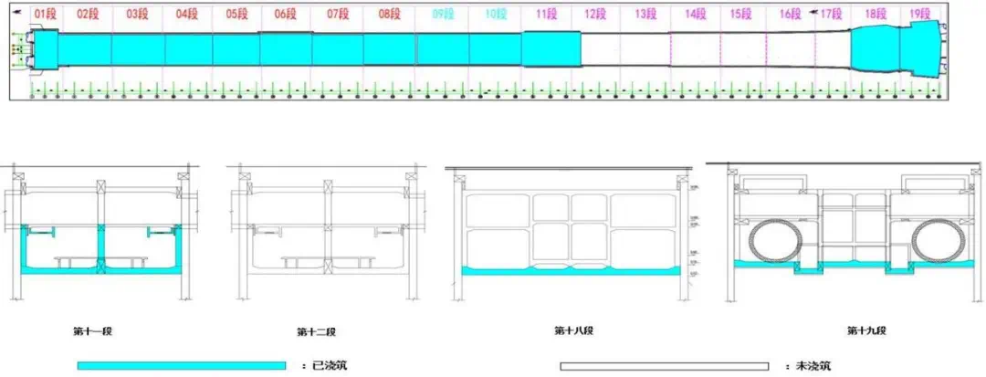 (前10段主体结构已封顶,第11段完成负二层侧墙及轨顶风道浇筑,第12/17段底板钢筋绑扎中,第18/19段底板已浇筑)