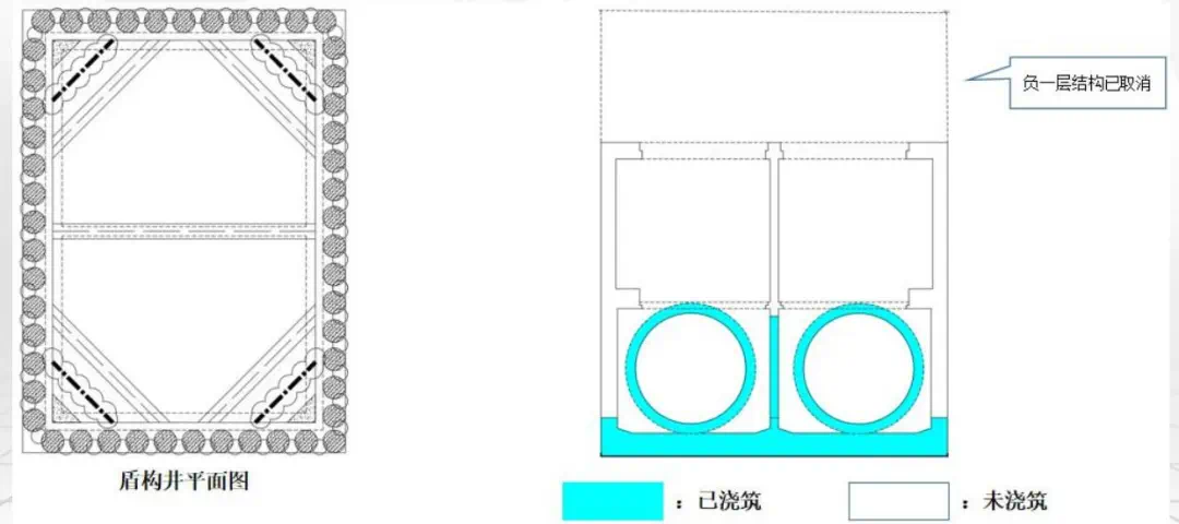 盾构井:地下两层结构,外包尺寸21.06×14.8m,开挖深度27m,明挖顺作法施工。