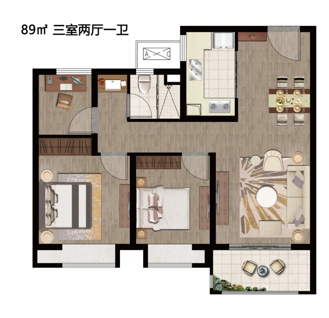 建面约89㎡户型赏析:户型方正,布局合理,三开间朝南设计,南向双卧均带有飘窗,为生活拓展了创意空间。客餐厅联通瞰景阳台,采光面充沛,通风透气性好,增加居住舒适性。
