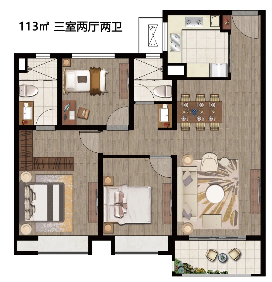 建面约113㎡户型赏析:三房两厅两卫,阳光通透,南向三开间大面宽。稀缺双卫生间配置,生活细节周到考虑。主卧舒适,宽景飘窗,尊享私密空间,彰显尊贵气度。阔景阳台,多面采光,拥揽四季景观。