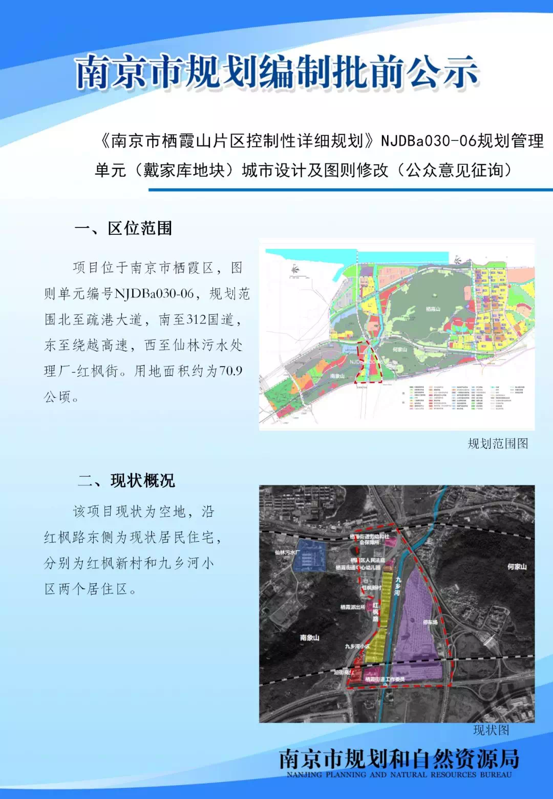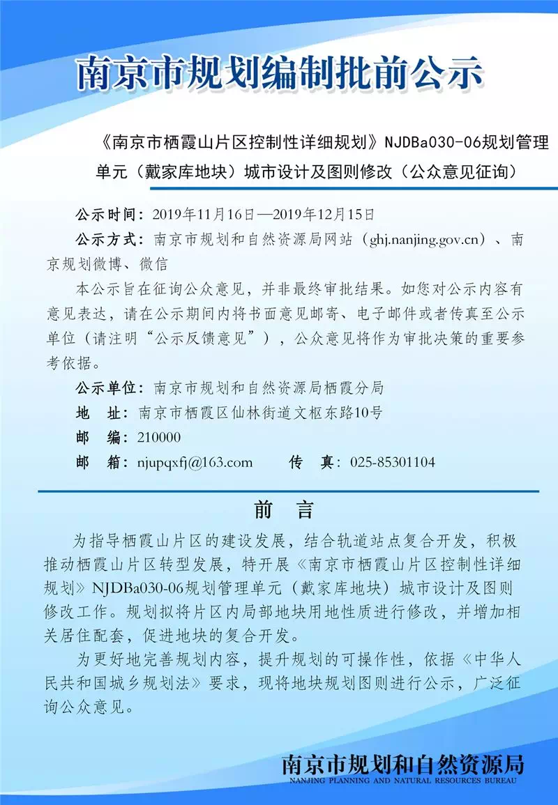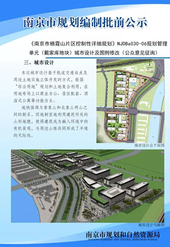 《南京市栖霞山片区控制性详细规划》NJDBa030-06规划管理单元(戴家库地块)城市设计及图则修改(公众意见征询)为指导栖霞山片区的建设发展,结合轨道站点复合开发,积极推动栖霞山片区转型发展,特开展《南京市栖霞山片区控制性详细规划》NJDBa030-06规划管理单元(戴家库地块)城市设计及图则修改工作。具体规划公示详见下图。
