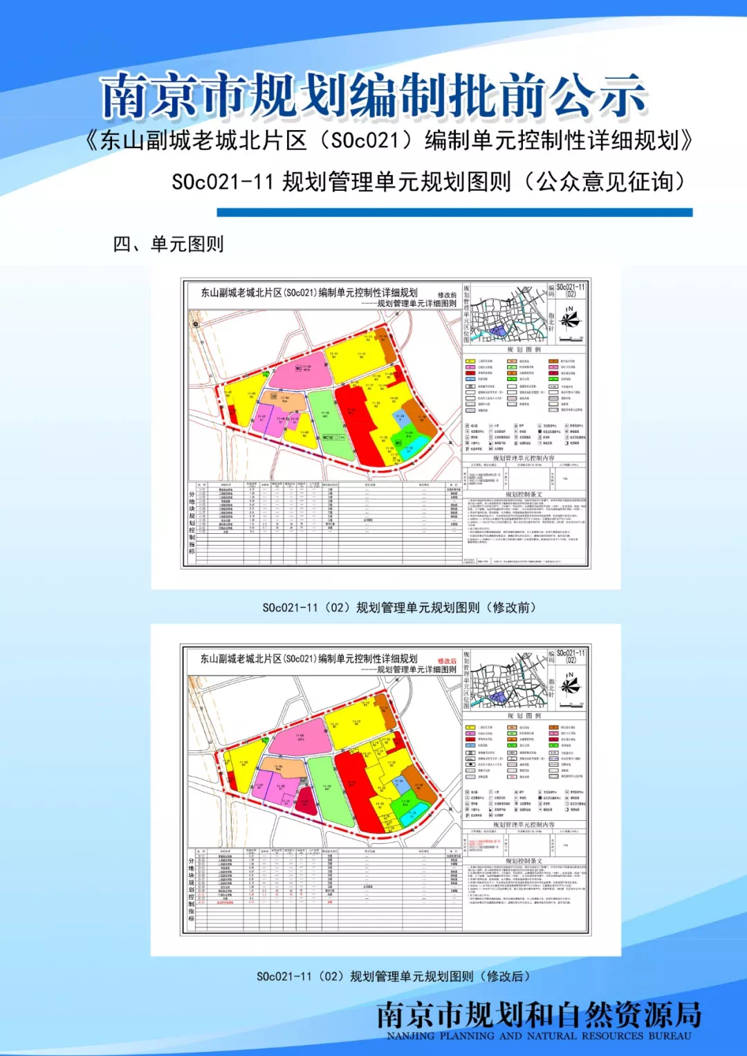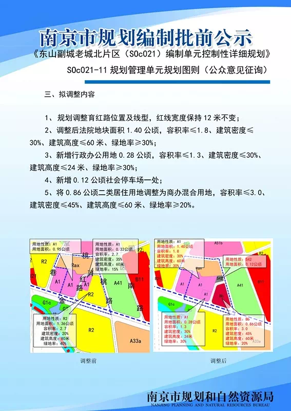 《东山副城老城北片区(S0c021)编制单元控制性详细规划》S0c021-11规划管理单元规划图则(公众意见征询)为完善江宁老城片区服务配套设施,满足区法院审判法庭扩建需求,南京市规划和自然资源局会同江宁区政府开展了江宁区法院扩建选址及所涉及的控详规划管理单元图则修改工作。现将地块规划图则内容向公众展示,广泛征询公众意见。