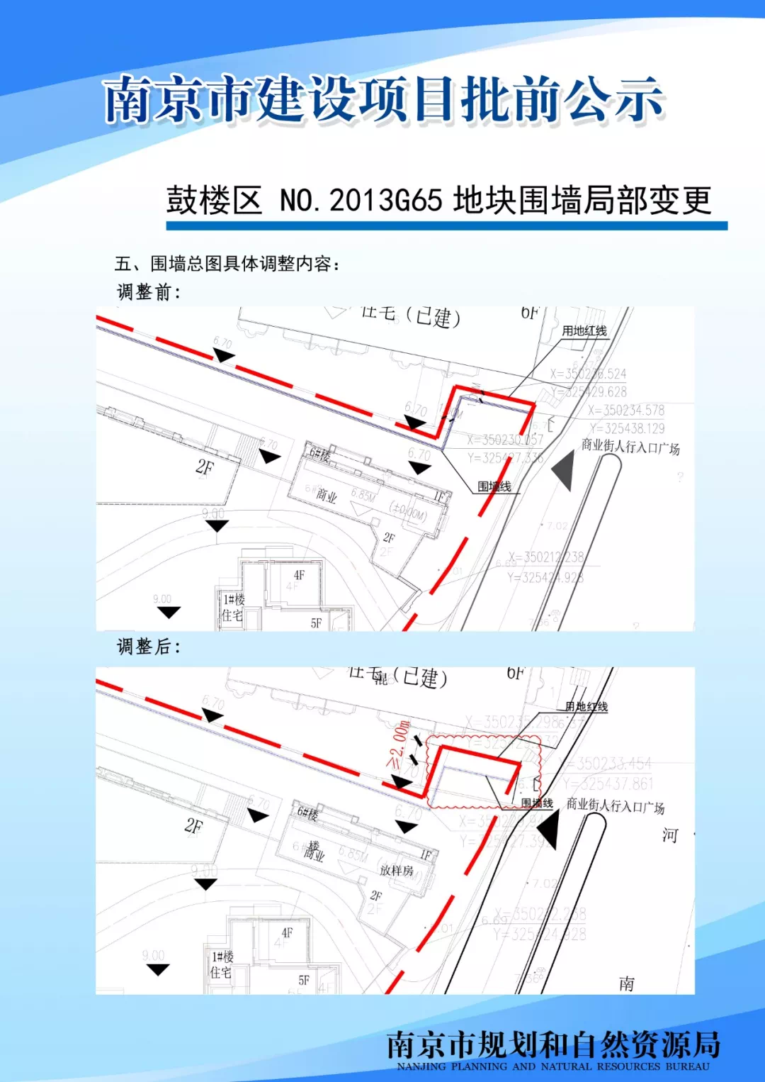 鼓楼区NO.2013G65地块围墙局部变更批前公示NO.2013G65地块项目北至现状小区,西至二板桥,南至淮滨路,东至热河南路。该项目于2019年4月2日取得围墙建设工程规划许可(证书编号:建字第320106201910522201300726号)。因项目建设实际需求,现拟优化调整6#楼北侧围墙位置。具体规划公示详见下图。