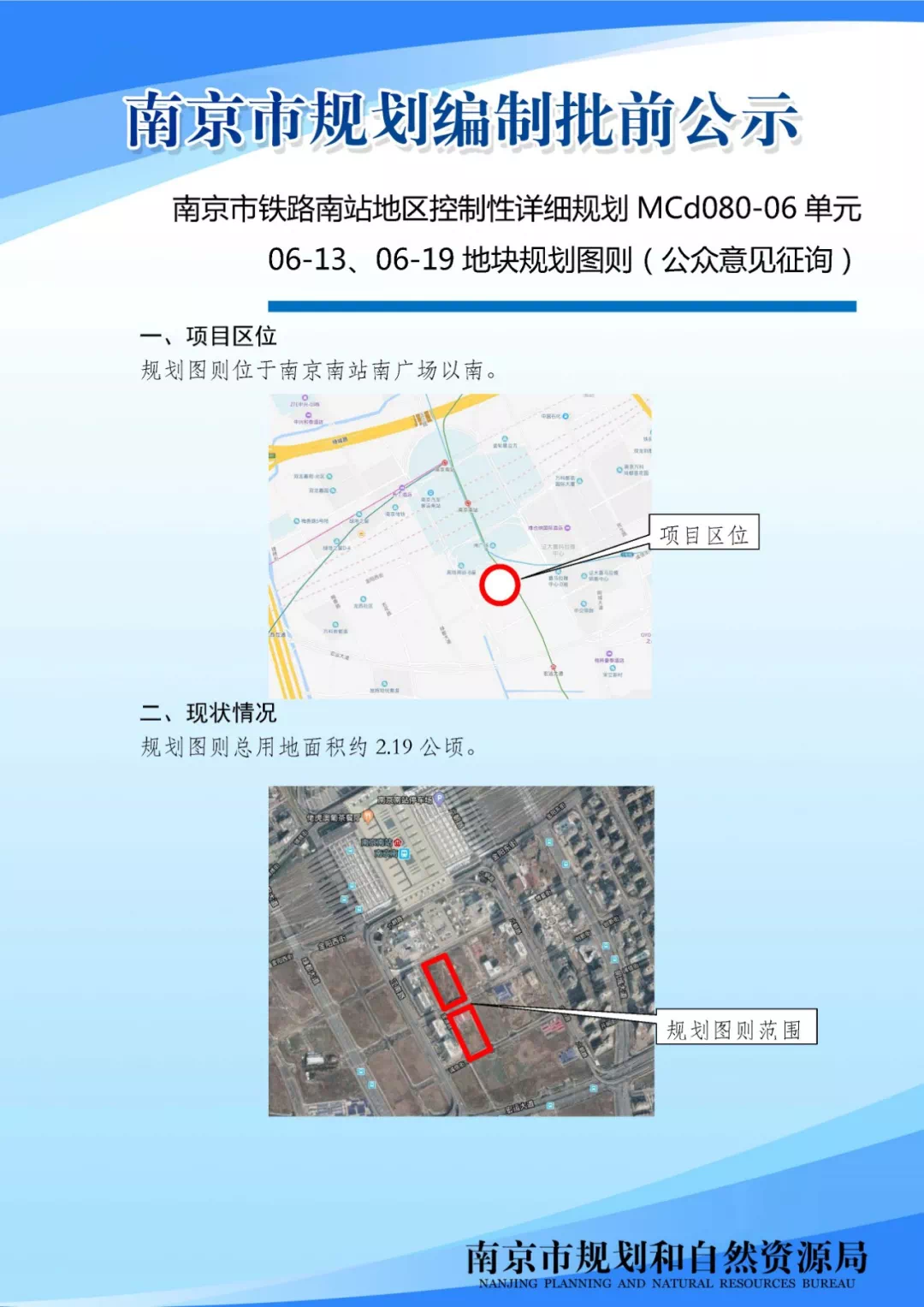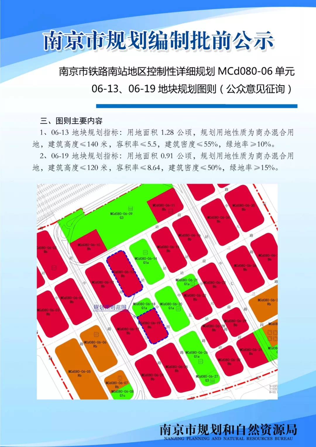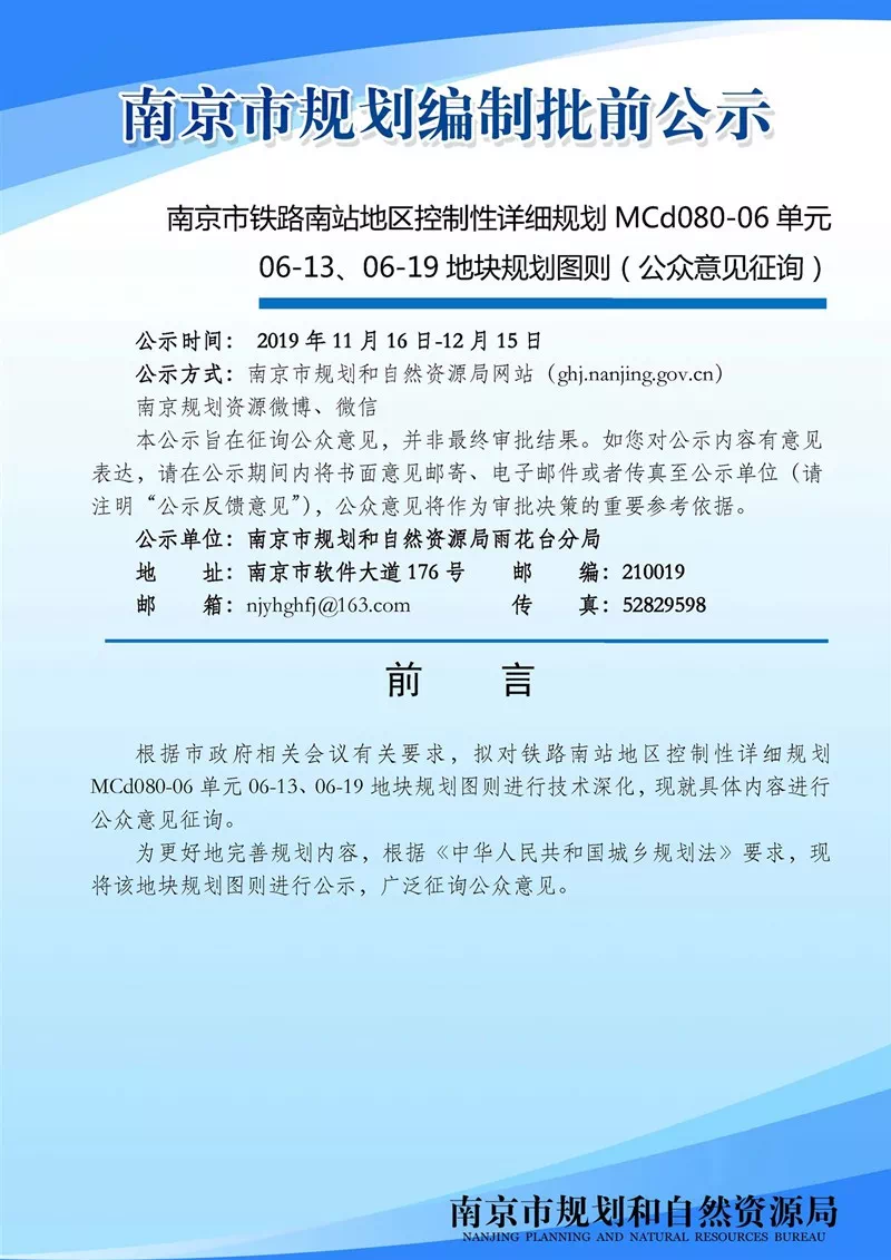南京市铁路南站地区控制性详细规划MCd080-06单元06-13、06-19地块规划图则(公众意见征询)根据市政府相关会议有关要求,拟对铁路南站地区控制性详细规划MCd080-06单元06-13、06-19地块规划图则进行技术深化,现就具体内容进行公众意见征询。现将该地块规划图则进行公示,广泛征询公众意见。