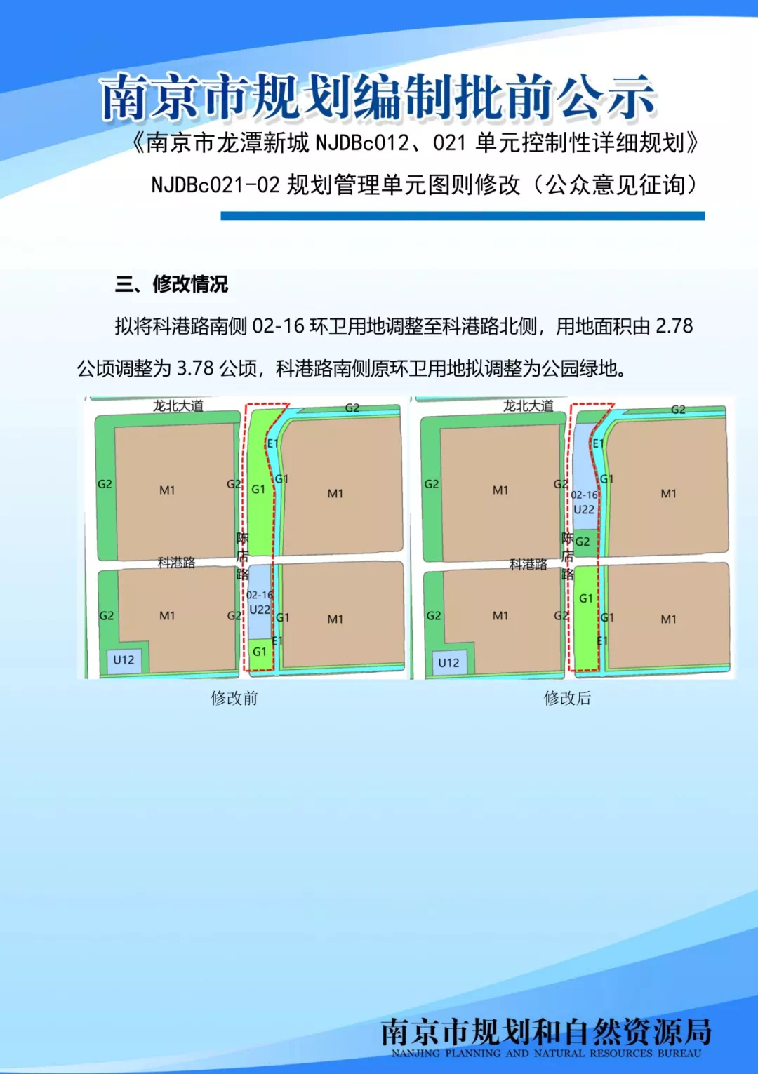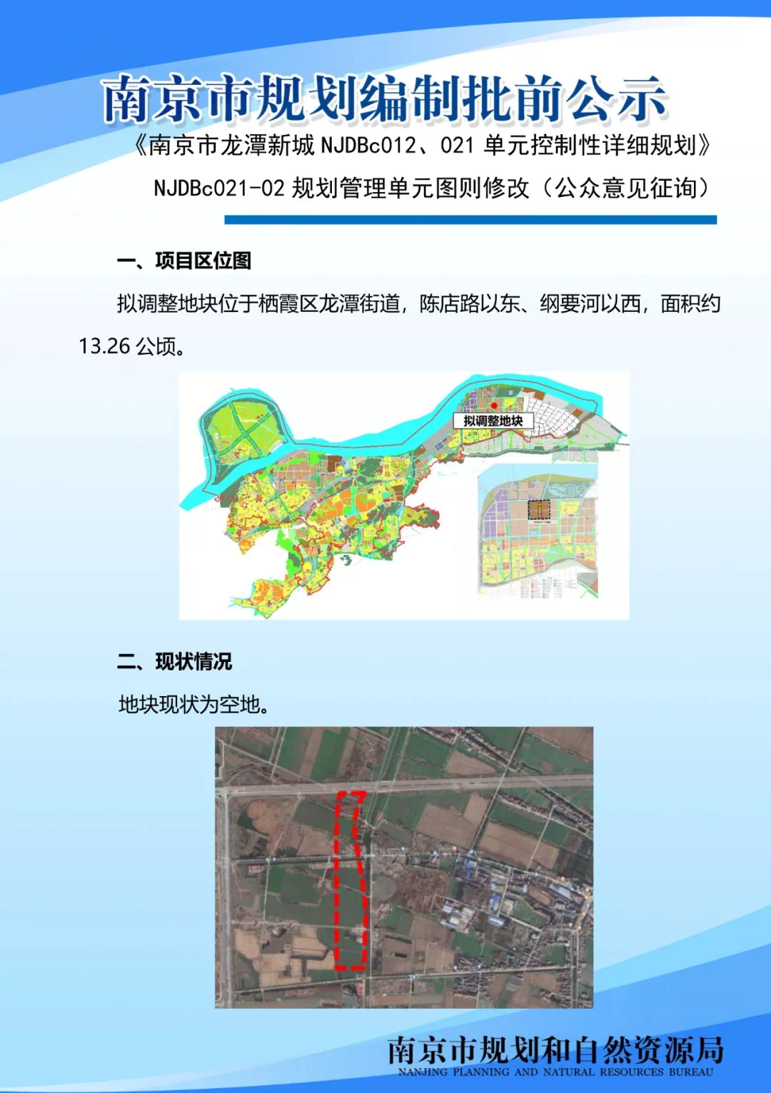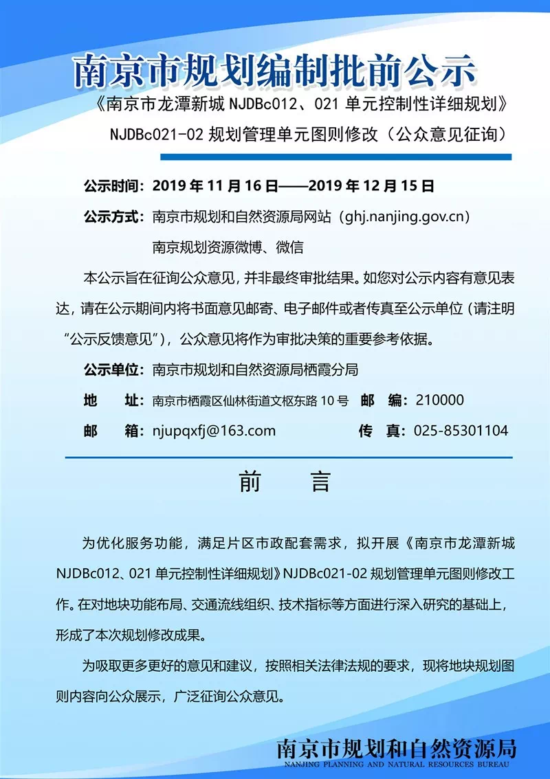 《南京市龙潭新城NJDBc012、021单元控制性详细规划》NJDBc021-02规划管理单元图则修改(公众意见征询)为优化服务功能,满足片区市政配套需求,拟开展《南京市龙潭新城NJDBc012、021单元控制性详细规划》NJDBc021-02规划管理单元图则修改工作。在对地块功能布局、交通流线组织、技术指标等方面进行深入研究的基础上,形成了本次规划修改成果。现将地块规划图则内容向公众展示,广泛征询公众意见。