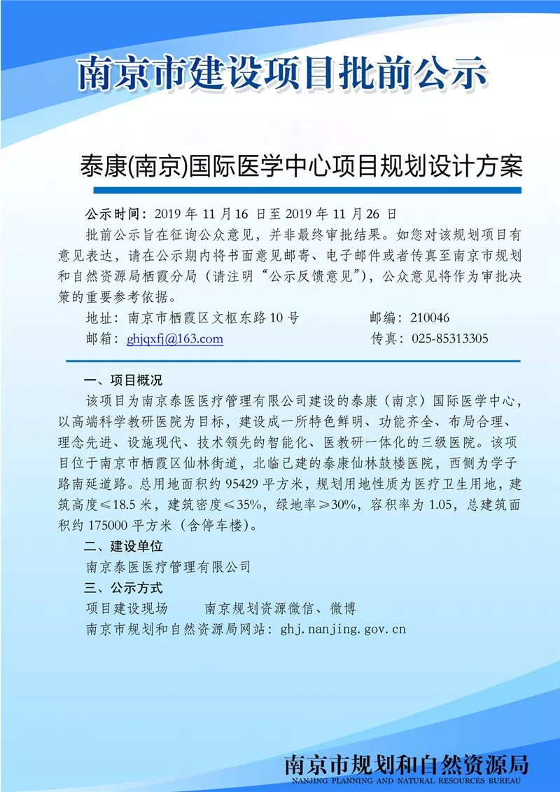 泰康(南京)国际医学中心项目规划设计方案批前公示该项目为南京泰医医疗管理有限公司建设的泰康(南京)国际医学中心,以高端科学教研医院为目标,建设成一所特色鲜明、功能齐全、布局合理、理念先进、设施现代、技术先进的智能化、医教研一体化的三级医院。具体规划公示详见下图。