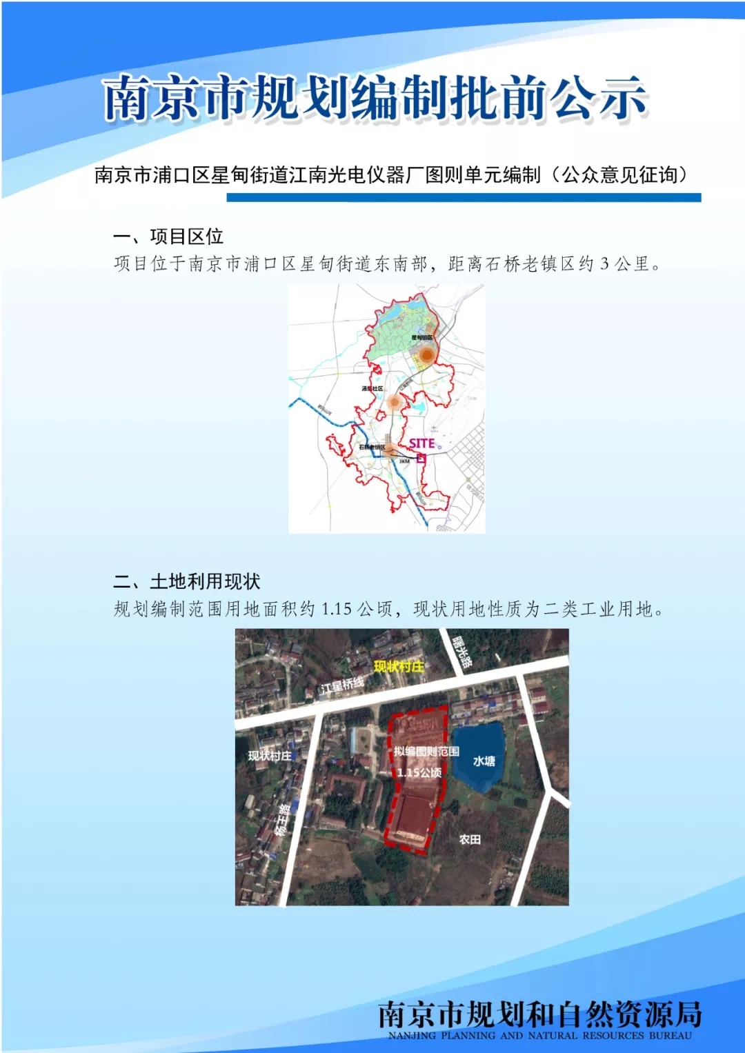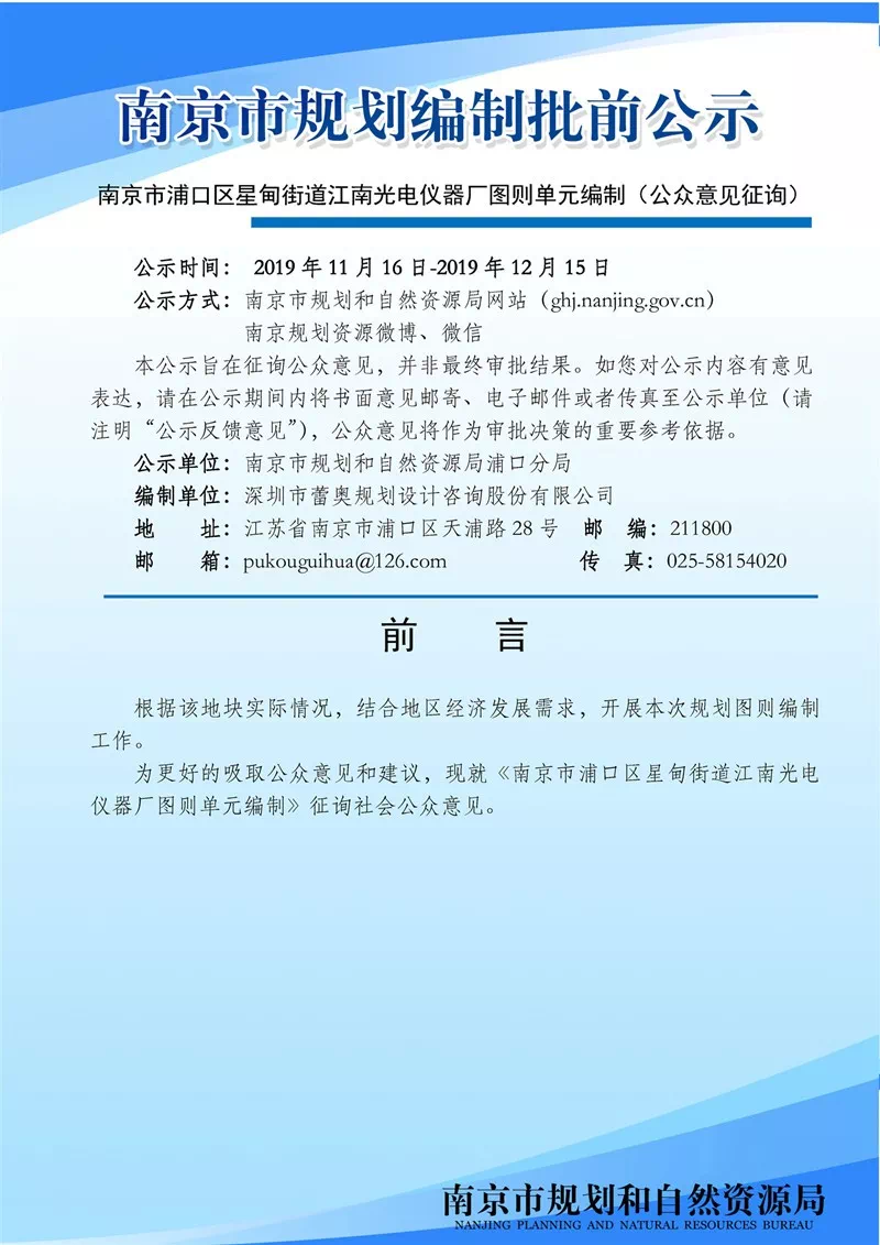 南京市浦口区星甸街道江南光电仪器厂图则单元编制(公众意见征询)根据该地块实际情况,结合地区经济发展需求,开展本次规划图则编制工作。为更好的吸取公众意见和建议,现就《南京市浦口区星甸街道江南光电仪器厂图则单元编制》征询社会公众意见。