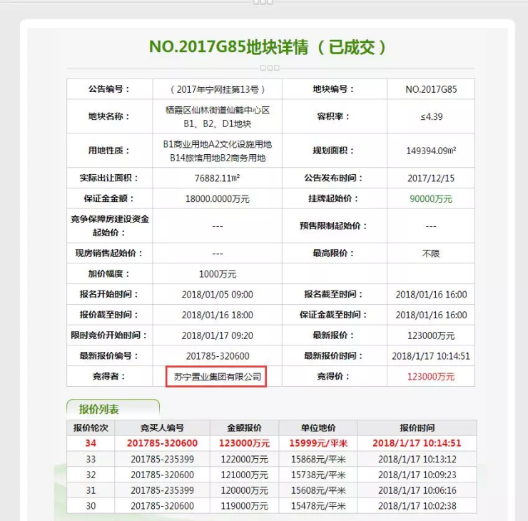 最终,这位新杀出的买家揭晓,苏宁置业拿下仙林G85地块,成交总价12.3亿!