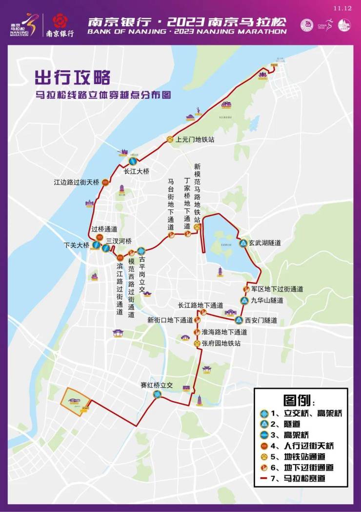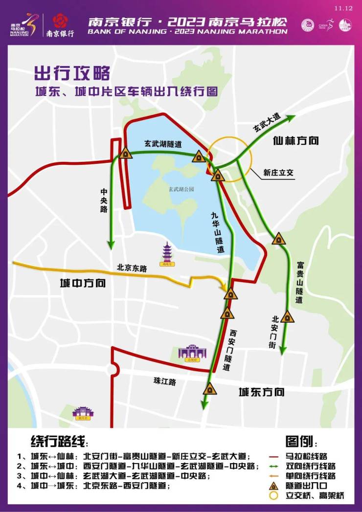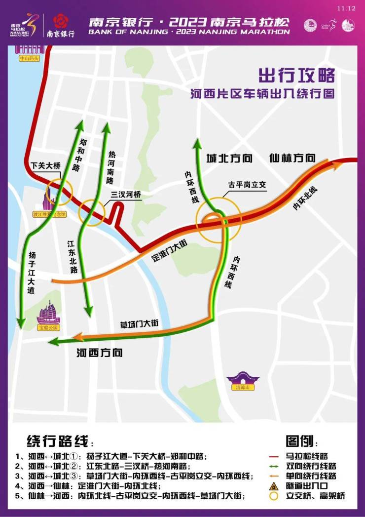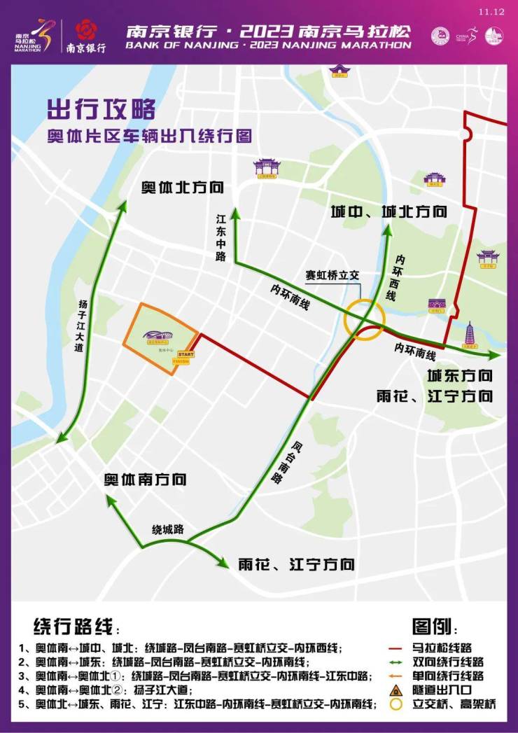 11月12日7:00开始至比赛结束,下列时间、道路除持2023南京马拉松赛专用证件的车辆外,采取以下分时、分段禁止通行措施: