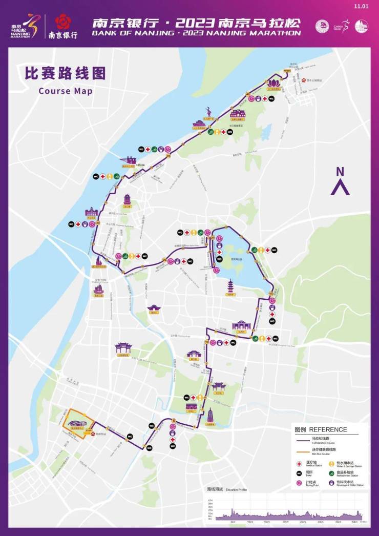 1、全程马拉松赛道(42.195公里):南京奥体中心东门起点→江东中路(反道)→梦都大街→凤台南路地面道路→应天大街地面道路→雨花路→中华路→白下路→中山南路→中山路→长江路→汉府街→龙蟠中路(反道)→龙蟠中路珠江路路口→龙蟠中路→北京东路→龙蟠路(反道)→环湖路→玄武门→神武路→板井巷→中央路→新模范马路(辅道)→模范中路(辅道)→模范西路(辅道)→淮滨路→姜家圩折返点→江边路→宝塔桥西街→燕江路(反道)→永济大道→燕津大道→燕子矶滨江公园全程终点。