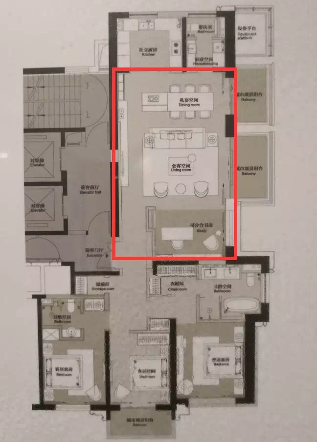 再看下天誉210平米户型(中间户),南侧阳台打通交付。客厅开间将近5米,加上书房后的总面宽可达7-8米。