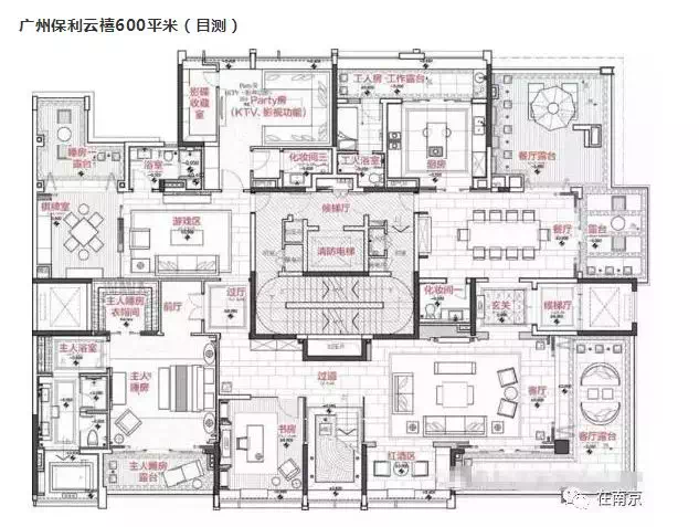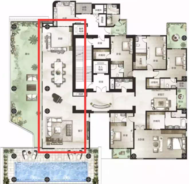 以超大横厅为代表,各种前厅(代替玄关)、边厅(利用拐角)、过厅(代替过道)、主仆分道分梯、270度环幕、天幕露台设计,甚至还有划分得更细致的:红酒区、游戏区、棋牌区、影碟收藏室、party房、化妆间、空中泳池等,都是为了打造比传统住宅更全面、更优质的先进居住体验。