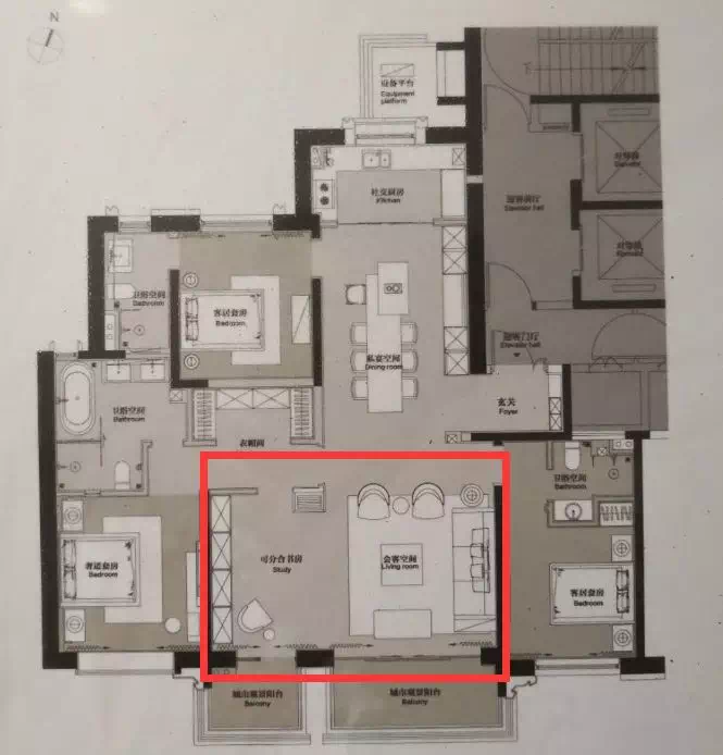 并非南京许久不见大世面。至少在过去十多年,为了大面宽的横厅去牺牲一个卧室,这样的布局并不很受南京市场的认可。