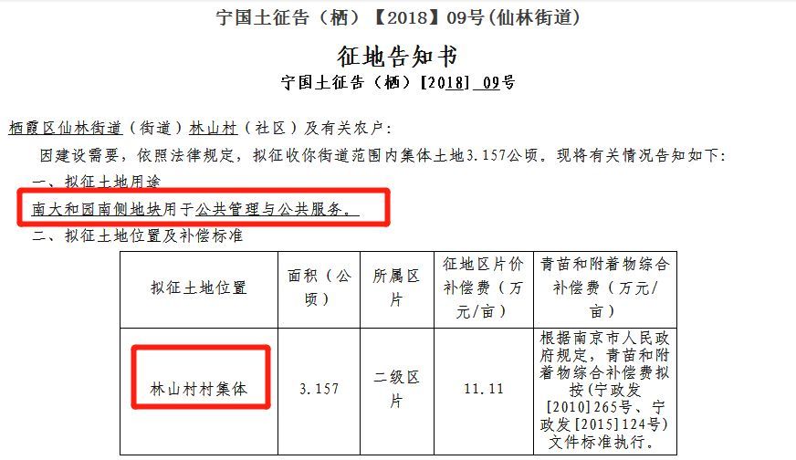 3、日前,市政府办公厅发布了《宁国土征告(栖)【2018】09号(仙林街道)》文件。文件内容显示:因建设需要,依照法律规定,拟征收栖霞区仙林街道(街道)林山村(社区)及有关农户范围内集体土地3.157公顷。拟征土地为南大和园南侧地块,用于公共管理与公共服务。
