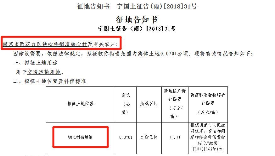 1、11月初,市政府办公厅发布了《宁国土征告(雨)[2018]31号征地告知书》,文件内容显示:南京市雨花台区铁心桥街道铁心村及有关农户:因建设需要,依照法律规定,拟征收你街道范围内集体土地0.0701公顷。拟征土地用途用于交通运输用地。