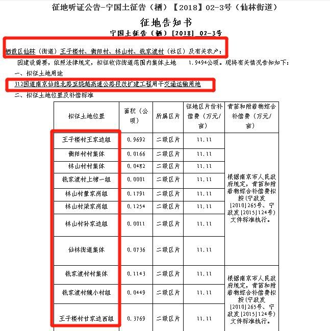 7、市政府办公厅发布《征地听证公告-宁国土征告(栖)【2018】02-3号(仙林街道)》栖霞区仙林(街道)王子楼村、衡阳村、林山村、钱家渡村(社区)及有关农户:因建设需要,依照法律规定,拟征收你街道范围内集体土地 1.9494公顷。拟征土地用途:312国道南京仙隐北路至绕越高速公路段改扩建工程用于交通运输用地。