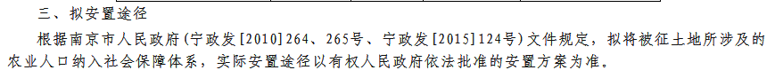 拟安置途径:根据南京市人民政府(宁政发[2010]264、265号、宁政发[2015]124号)文件规定,拟将被征土地所涉及的农业人口纳入社会保障体系,实际安置途径以有权人民政府依法批准的安置方案为准。