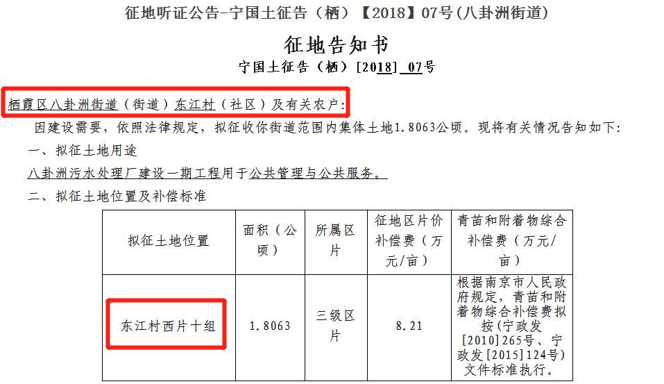 4、市政府办公厅发布《征地听证公告-宁国土征告(栖)【2018】07号(八卦洲街道)》栖霞区八卦洲街道(街道)东江村(社区)及有关农户:因建设需要,依照法律规定,拟征收你街道范围内集体土地1.8063公顷。拟征土地用途八卦洲污水处理厂建设一期工程用于公共管理与公共服务。