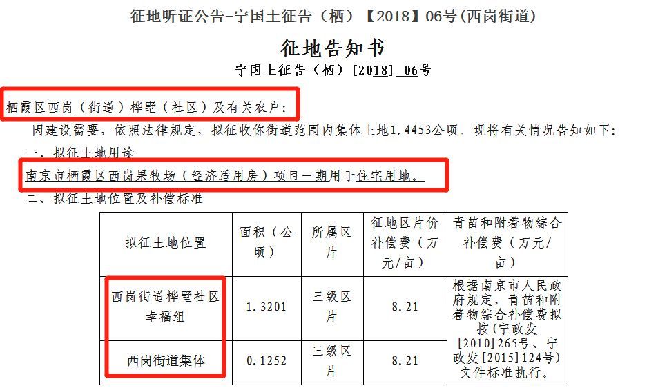 6、市政府办公厅发布《征地听证公告-宁国土征告(栖)【2018】06号(西岗街道)》栖霞区西岗(街道)桦墅(社区)及有关农户:因建设需要,依照法律规定,拟征收你街道范围内集体土地1.4453公顷。现将有关情况告知如下:南京市栖霞区西岗果牧场(经济适用房)项目一期用于住宅用地。