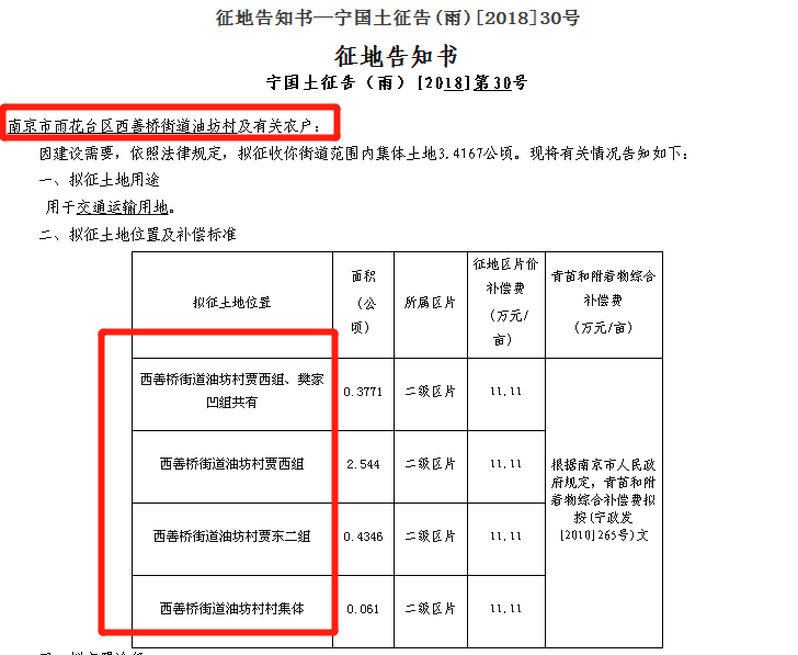 2、市政府办公厅发布《宁国土征告(雨)[2018]30号征地告知书》南京市雨花台区西善桥街道油坊村及有关农户:因建设需要,依照法律规定,拟征收你街道范围内集体土地3.4167公顷。