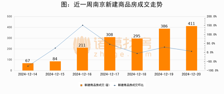 根据南京市住房保障和房产局数据显示,2024年12月20日南京新建商品房成交411套,较昨日增加25套,环比上涨6.5%