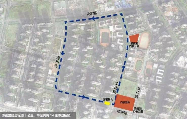 此次规划的游船游览线路名称为“老百姓家门口的幸福河”,起点位于建邺区文远街与螺塘路交叉口西北处,串联“文远河—元前河—天保东河—螺塘河”一圈回到原点,路线全程约 3 公里,经过 14 座桥梁,全线设置两个上岸码头,一个在起终点,一个在爱情湾公园内。