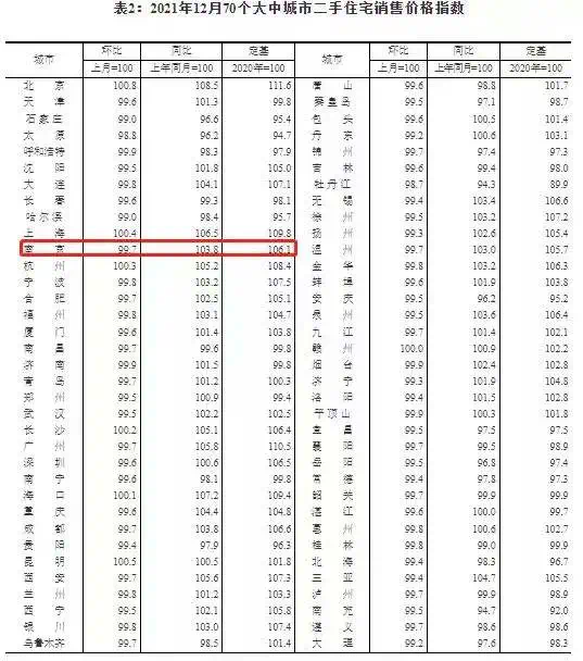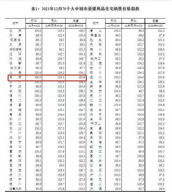 今天上午,国家统计局较新发布了2021年12月份70个大中城市商品住宅销售价格变动情况统计数据。其中,12月南京新房价格环比上涨0.3%、同比上涨4.1%,二手房价格环比下降0.3%、同比上涨3.8%。