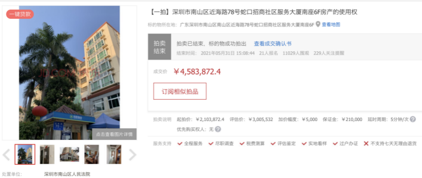 值得注意的是,标的物详情中明确提出,该房产无抵押,无房产证,按合同规定购买方只拥有使用权,南山区人民法院负责清场交付。