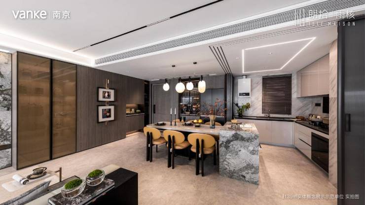 除了收纳功能的强大,万科 朗拾|雨核也对居家的社交方式进行了重新审视。在建面约99/115/139㎡三个不同的户型中,设计师根据空间情况打造不同类型的开放式厨房,分别通过通透性厨房、可自由开合的推拉门+类岛台、三轨折叠移门+洄游式岛台的独特设计,突破传统厨房与外界的空间屏障,有效延伸视觉空间。