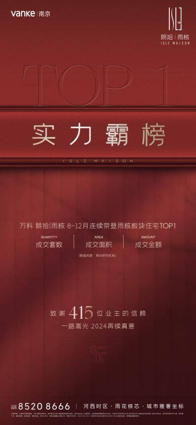 项目自面世以来,一路高光实绩不断。7月29日,项目首开燃动全城,开盘成交套数刷新南京2023首开记录。随后以傲销成绩占领8月南京新房项目业绩榜第一(数据来源:克尔瑞),8-12月更是霸榜雨核板块成交套数、面积、金额三项第一,五连冠持续问鼎住宅热销榜首。