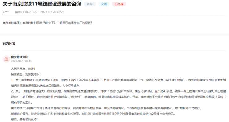 近期,人民网留言板上有网友咨询:南京地铁11号线何时完工?二期是否有通往大厂的规划?