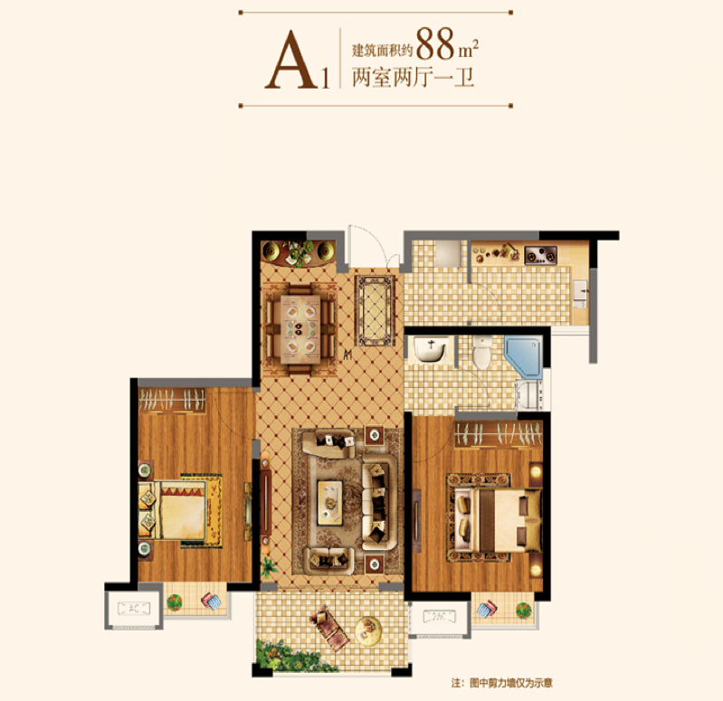 从产品上看,滨江雅园在售建筑面积约88-127㎡,舒适两居,宽敞三居,满足客户对户型的不同需求。建面约88㎡户型,格局方正,三面采光大气敞亮 ;干湿、动静分离,空间互不干扰;双卧室朝南,沐浴更多清风阳光;客厅连接观景阳台,收藏滨江美景。