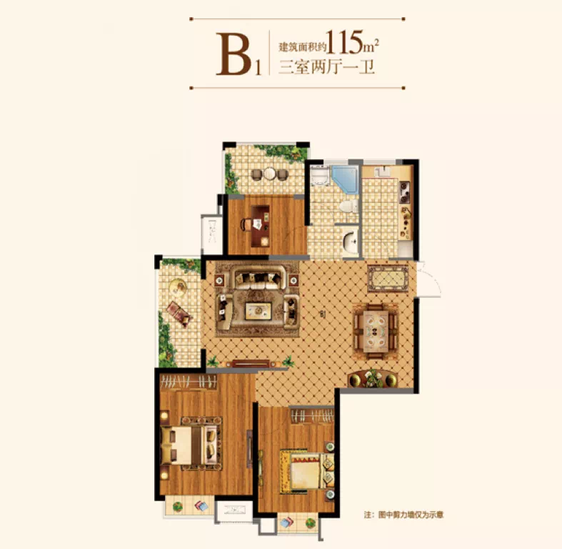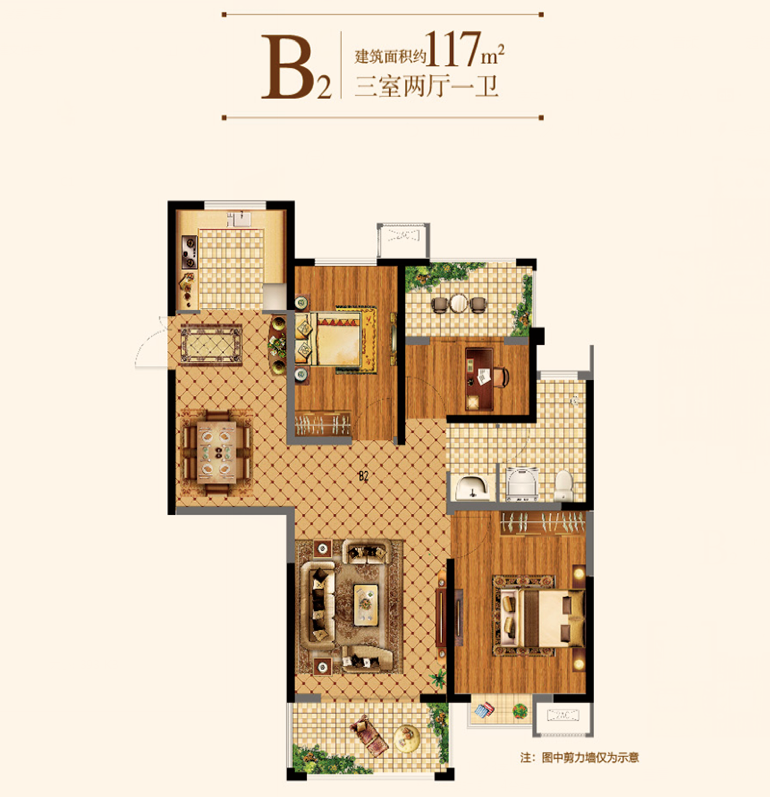 建面约117㎡为经典三房,全明户型,南北通透;主卧飘窗设计,室内尽享阳光满溢;主卧朝南带飘窗,沐浴更多清风阳光。