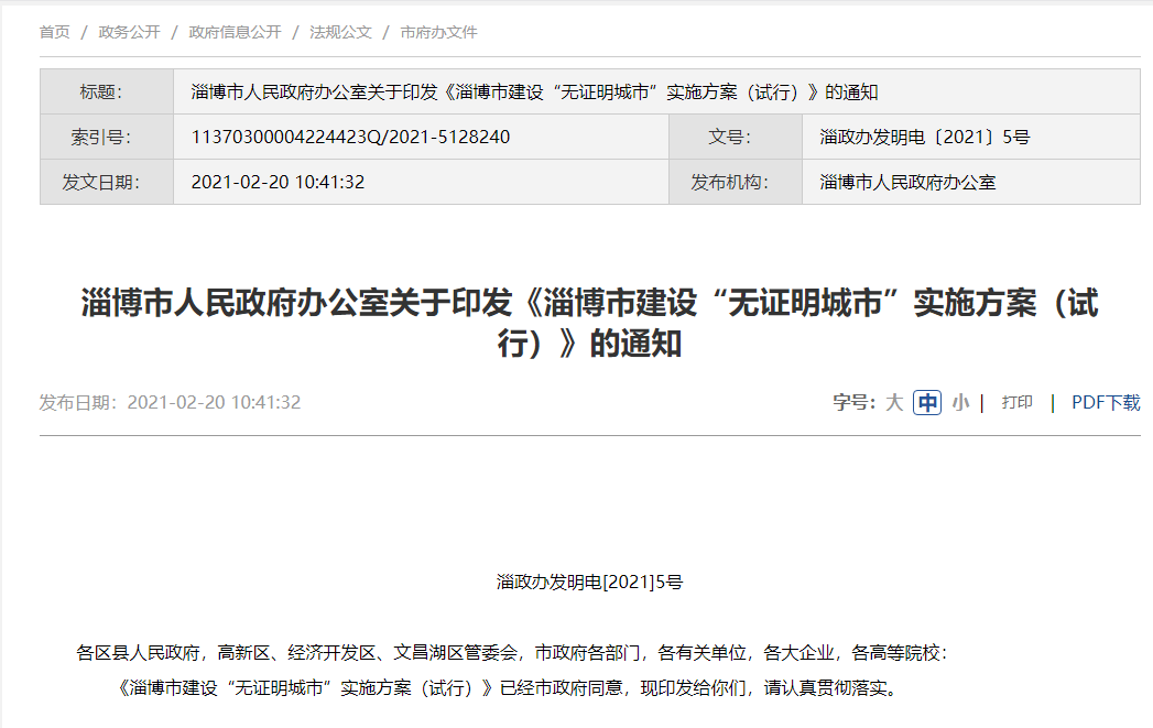 2月20日,淄博市人民政府办公室发布关于印发《淄博市建设“无证明城市”实施方案(试行)》的通知,提出依托数据归集和共享,全面推进“减证便民”,尽快实现“法无规定一律取消”和“法有规定无需提交”的“无证明城市”建设目标,方便企业和群众办事创业。