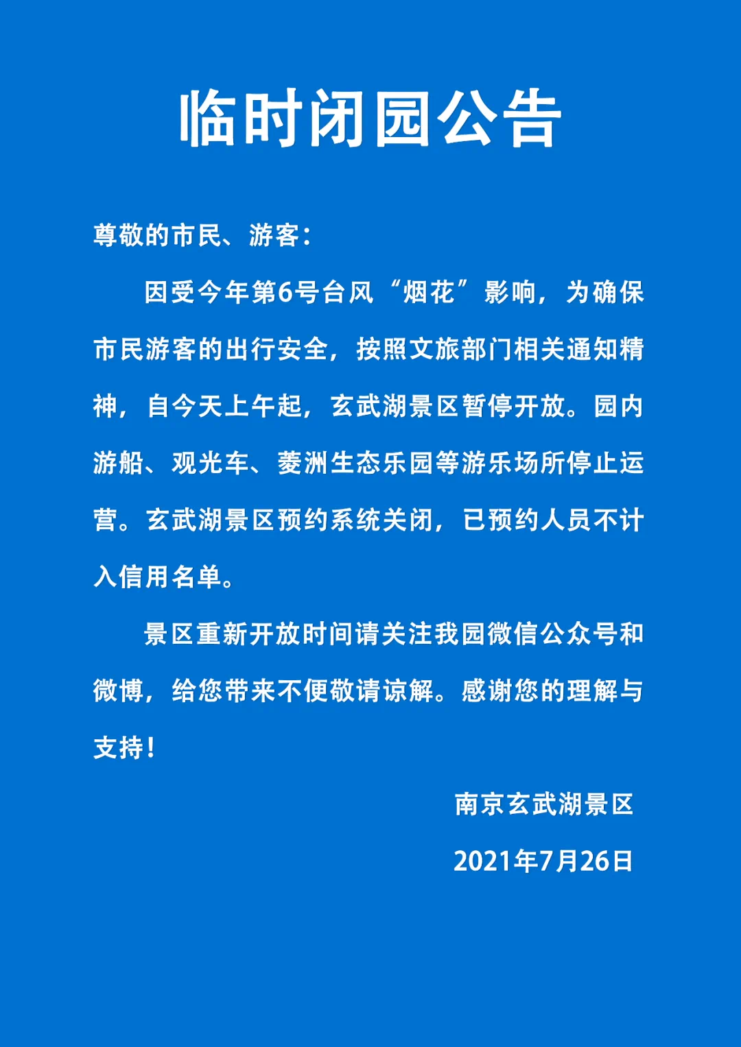 因受台风“烟花”的影响,为确保游客出行安全,接上级文旅部门通知,自2021年7月26日起,钟山风景区所属的中山陵、明孝陵、灵谷景区,音乐台、美龄宫、白马公园等景点,以及明孝陵博物馆、孙中山纪念馆、南京抗日航空烈士纪念馆等文博场馆均暂停开放。紫金山索道、区内电瓶车等设施停运。中山陵预约系统关闭,已预约游客不计入信用名单。各网络销售票按原渠道退回。 景区开放时间另行通知,给您带来的不便敬请谅解。恳请相互告知。