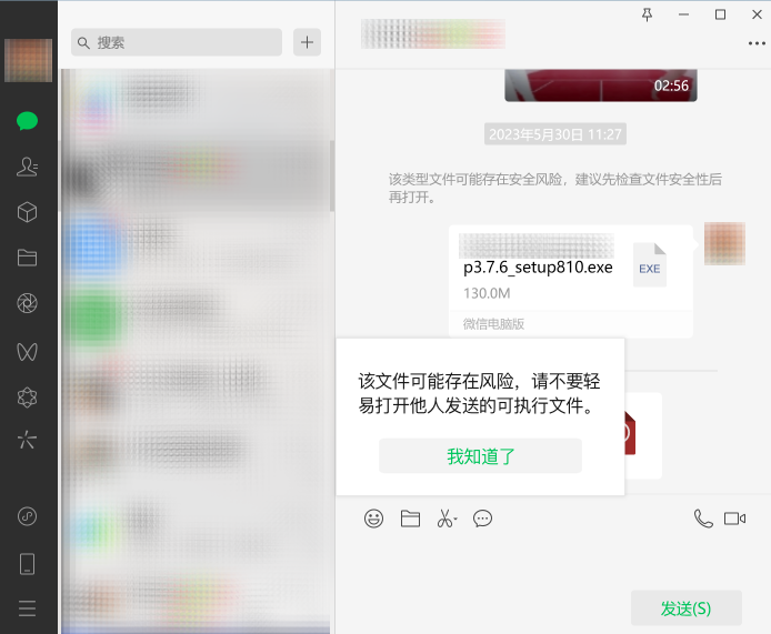 针对此类可能存在木马病毒风险的文件,微信平台也会对用户做出安全提示,请大家在看到系统提示时一定要提高警惕。必要时建议先退出微信,对电脑进行杀毒处理。