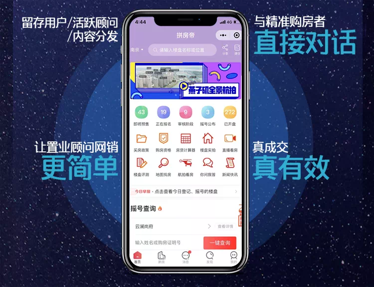找楼盘、查摇号、搜房价、聊顾问,拼房帝里全流程覆盖。专业的用户运营视角,搭建高效沟通平台。置业顾问可以实现和精准购房者直接对话。引爆项目热度,吸引用户,更好的留存用户,让网销更简单。3科技提升智慧力SaaS产品系和售楼云体系,提供一站式数字化营销解决方案,化繁为简,致力于实现买房全流程一站式解决。Saas产品系,提供完整、丰富的智能化线上产品,涵盖开发商从前期蓄客至后期推盘的各个环节。