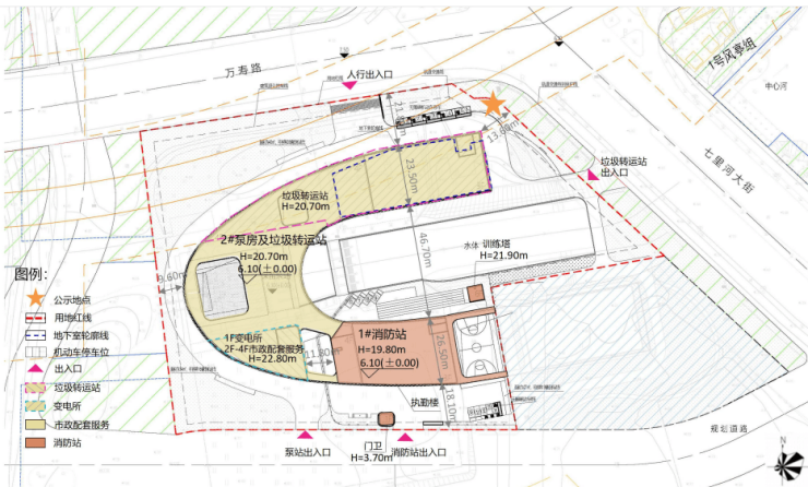 项目位于七里河大街以西,万寿路以南、七里河以东、规划道路以北。规划用地性质为U 公用设施用地,用地面积约2.03万平方米,容积率≤1.0,建筑高度≤24米。拟建总建筑面积约1.6万平方米,其中地上建筑面积约1.5万平方米,地下建筑面积约0.12万平方米。主要建设内容为新建消防站、垃圾转运站、对现状泵站改造升级、其他附属配套用房及相关附属设施建设等