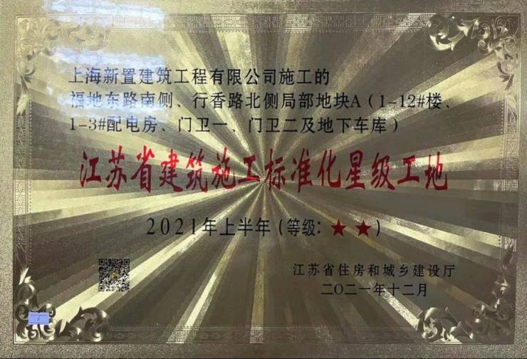在近日,江苏省住房和城乡建设厅公布的2021年江苏省建筑施工标准化星级工地名单上,由上海新置建筑工程有限公司施工的“旭辉宸悦赋”项目工地榜上有名,荣获“江苏省建筑施工标准化星级工地(★★)”称号。