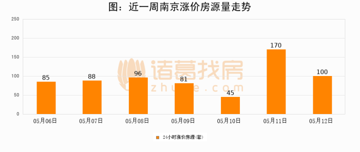 根据诸葛找房数据显示,南京24小时涨价房源量为100套,较05月11日减少70套,环比下降41.2%。与此同时,涨价房源占比小幅回落,对于购房者来说是一个入市窗口期,购房者可抓住时机入市。