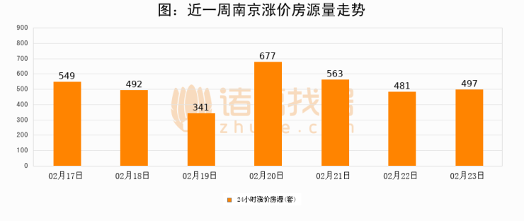 根据诸葛找房数据显示,南京24小时涨价房源量为497套,较02月22日增加16套,环比上涨3.3%。与此同时,涨价房源占比小幅扩大,业主信心有所提升。