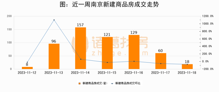 根据南京市住房保障和房产局数据显示,2023年11月18日南京新建商品房成交18套,较昨日减少42套,环比下降70%