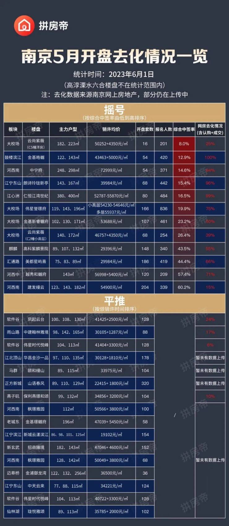 据不完全统计,整个5月南京(除六合、溧水、高淳)领销许的盘共计27家,其中有11家摇号,16家平推。