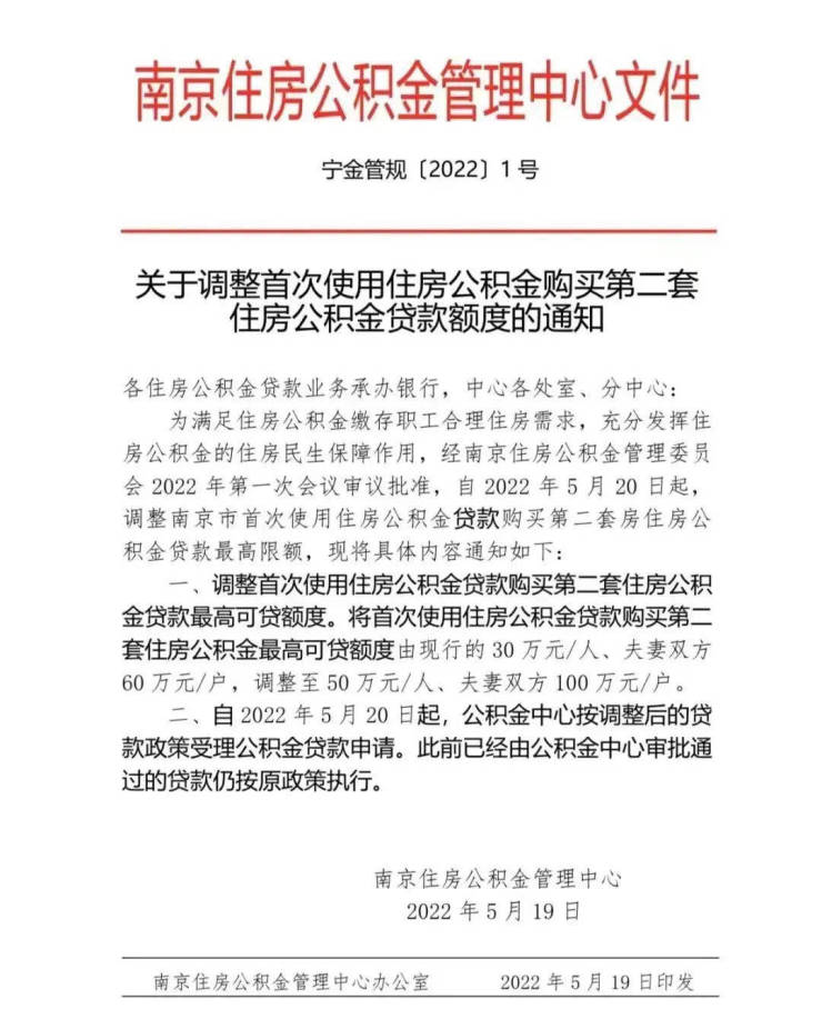提升公积金贷款额度。将首次使用住房公积金贷款购买第二套住房公积金较高可贷额度由现行的30万元/人、夫妻双方60万元/户,调整至50万元/人、夫妻双方100万元/户,切实减轻刚性改善群体购房负担。自2022年5月20日起,公积金中心按调整后的贷款政策受理公积金贷款申请。此前已经由公积金中心审批通过的贷款仍按原政策执行。