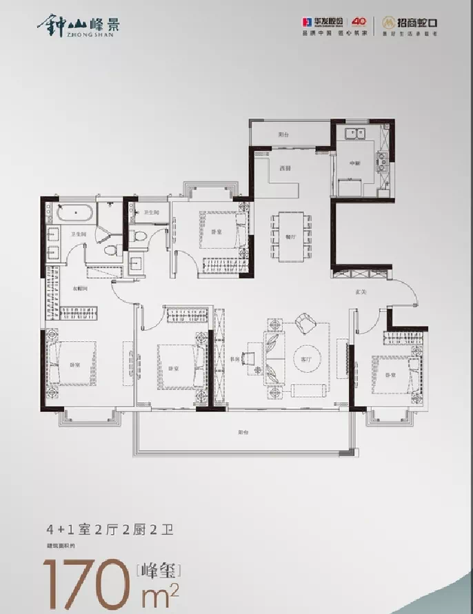 170平户型五开间朝南,巨幅面宽,连接客厅和次卧的双阳台约8.9米。