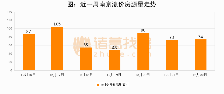 根据诸葛找房数据显示,南京24小时涨价房源量为74套,较12月21日增加1套,环比上涨1.4%。与此同时,涨价房源占比小幅扩大,业主信心有所提升。