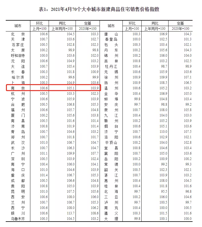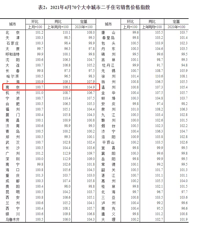 今天上午,国家统计局较新发布了2021年4月份70个大中城市商品住宅销售价格变动情况统计数据。其中,4月南京新房价格环比上涨0.6、同比上涨5.1%,二手房价格环比上涨0.7%、同比上涨6.1%。
