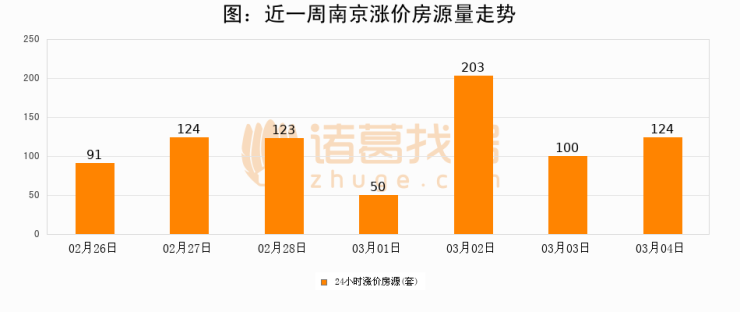 根据诸葛找房数据显示,南京24小时涨价房源量为124套,较03月03日增加24套,环比上涨24%。与此同时,涨价房源占比小幅扩大,业主信心有所提升。