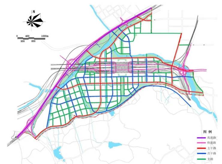 在道路系统上,该片区以北站枢纽集疏运体系和片区交通支撑为核心,将形成两横两纵的区域快速路网络与三横二纵的地区主干路网,构筑内外畅达的交通路网。