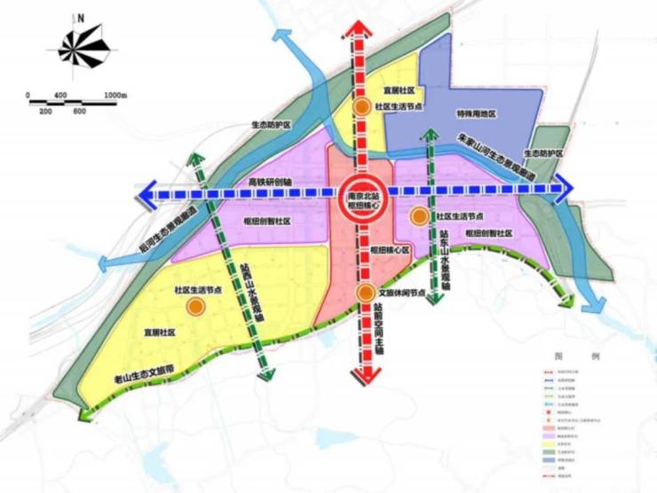 具体四至为东至文景路、南至一道河、北至沿山大道、西北至宁连高速。该片区空间布局结构中,一核为南京北站枢纽核心。